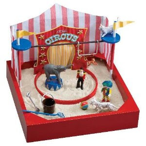Circus Time includes: 10"X10"X2" sandbox, 20"X20" no mess play mat, ultra fine sand, elephant, white tiger, swinging monkey, tight rope cat, clown, ringmaster, ball, elephant stand, circus stage with ring, rake, shovel, and sand pail!
